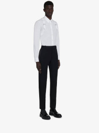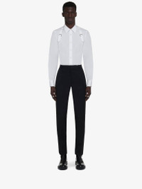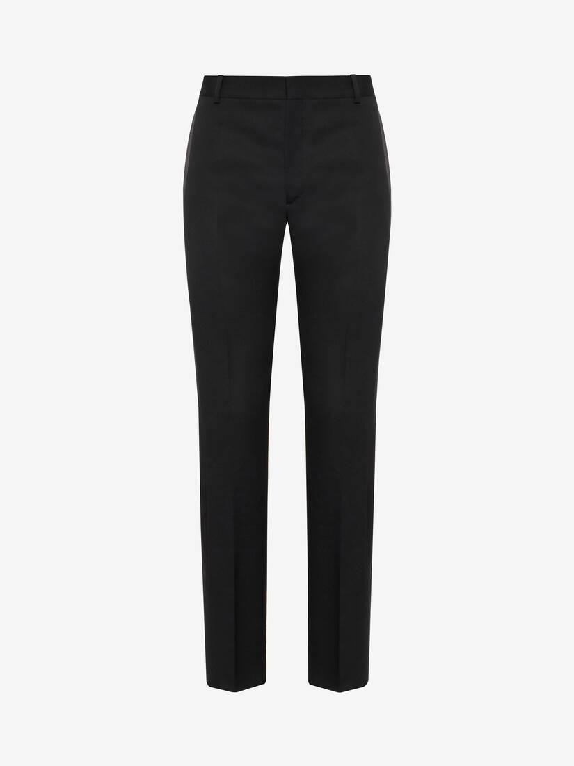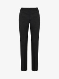 Tuxedo cigarette trousers in black wool grain de poudre with satin side stripes. The trousers feature two side pockets and two jetted pockets on the back. Finished with a concealed zip and hook fastening. For the full look, wear with the matching jacket. Product details - Belt loops - Side pockets - Concealed zip and hook fastening - Made with certified wool yarn - Product code: 735223QUAAG1000 - Made in Italy - Material: 100% Wool