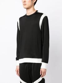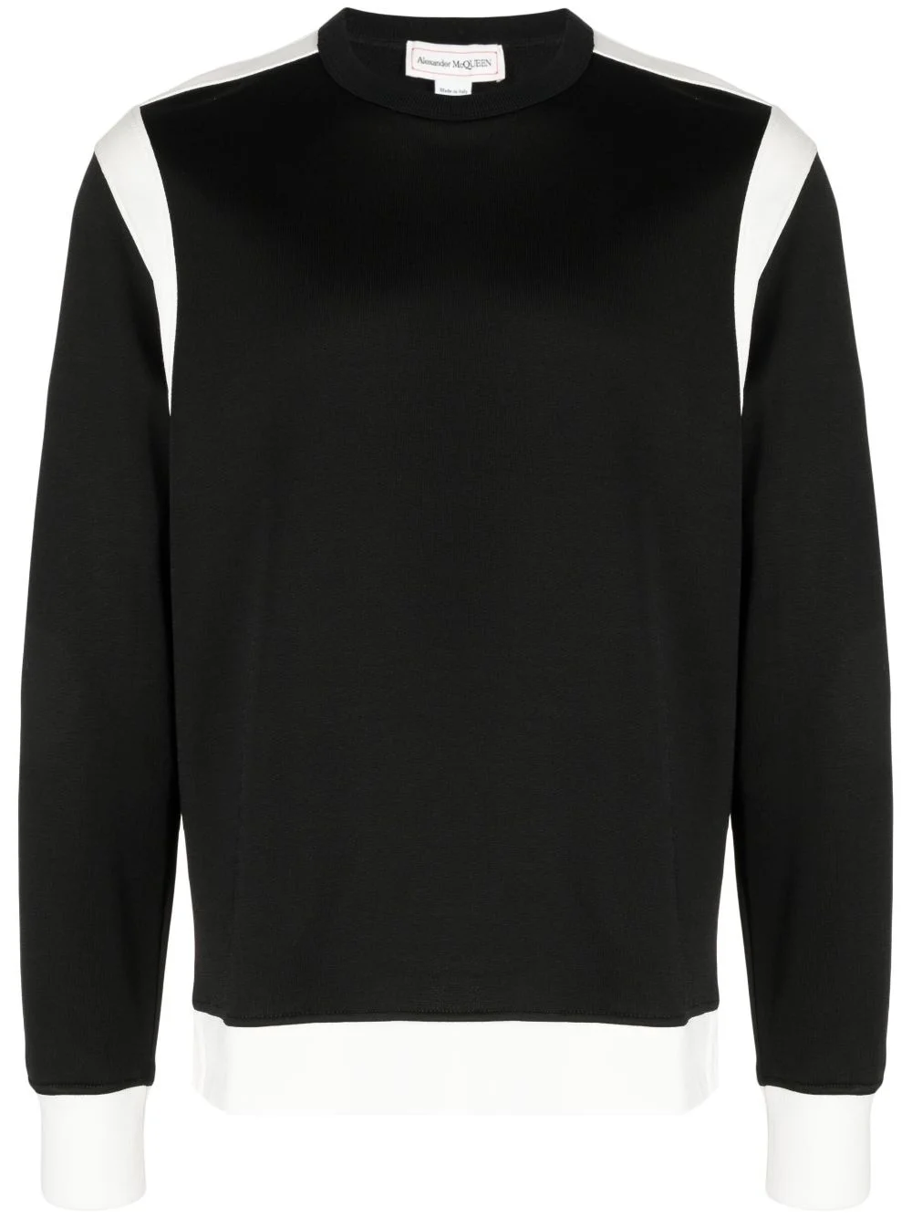 two-tone panelled sweatshirt This sweatshirt by Alexander McQueen features a two-tone panelled design that draws white lines against the black background. With a crew neck and long sleeves, this piece provides comfort for a casual look. Highlights - Black/white - Two-tone design - Panelled design - Crew neck - Stripe detailing - Long sleeves - Ribbed cuffs and hem - Contrasting border - Straight hem Made In Italy Composition Viscose 51%, Cotton 43%, Polyamide 6% SIZE & FIT Model measurements Height 6 ft 2 in(1.87 m) Bust/Chest 34.25 in(87 cm) Hips 36.22 in(92 cm) Waist 29.52 in(75 cm) Washing instructions Read Manufacturer Guidelines