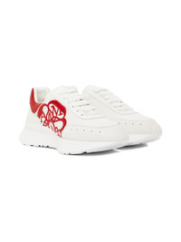 Low-top buffed calfskin sneakers in white and gray. · Perforated detailing at toe · Lace-up closure · Logo stamp at tongue and padded collar · Logo graphic embossed at outer side · Calfskin lining · Foam rubber midsole · Treaded rubber outsole Supplier color: White/Lust/Red Upper: calfskin. Sole: rubber.