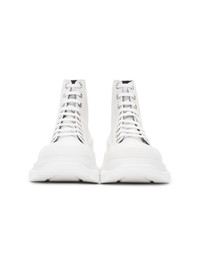 High-top suede sneakers in white. Round rubber cap toe. Tonal lace-up closure. Logo embossed in silver-tone at tongue. Webbing trim in black with logo printed in silver-tone at heel collar. Suede lining in black. Textured rubber trim in and embossed logo at welt. Textured platform rubber midsole. Treaded rubber outsole. Silver-tone hardware. Approx. 1.75" platform. Supplier color: White/White Upper: calfskin. Sole: rubber.