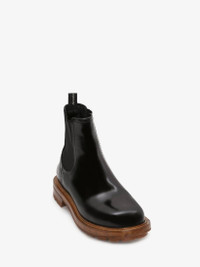 Black shiny spazzolato leather Worker Chelsea boot featuring a cedar brown thick sole with a wide leather welt and thick stitching. Finished with an Alexander McQueen signature in contrast on the ribbon tabs. Material: 100% Calf Leather