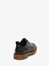 Black shiny spazzolato leather Worker Derby lace-up featuring a cedar brown think rubber lug sole with a wide leather welt and thick stitching. Finished with an Alexander McQueen signature in contrast on the ribbon tabs. Material: 100% Calf Leather
