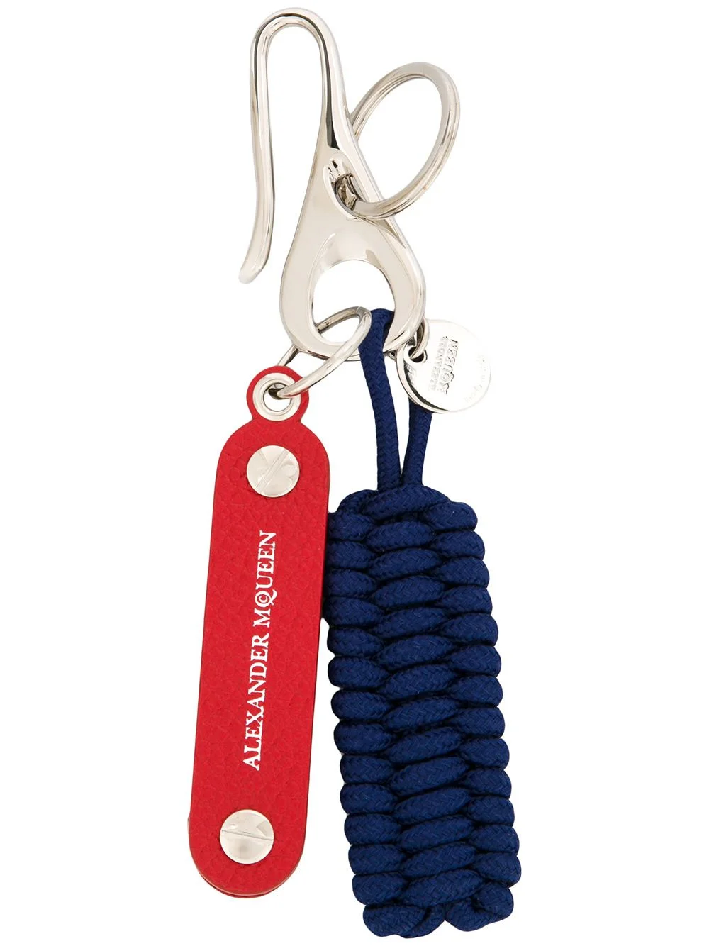 woven hook key ring Sarah Burton sought inspiration in ancient traditions. Presenting needlework embroidered accessories, colourful tweeds and threaded leather, it transports us to the bittersweet Medieval times. In Red calf leather and blue woven textile, this hook key ring from Alexander McQueen features silver-tone hardware, a hanging key fob, a silver-tone logo plaque, a printed logo and a woven design. Made in Italy Composition Calf Leather 100% SIZE & FIT Measurement LENGTH 7.08 in(18 cm)