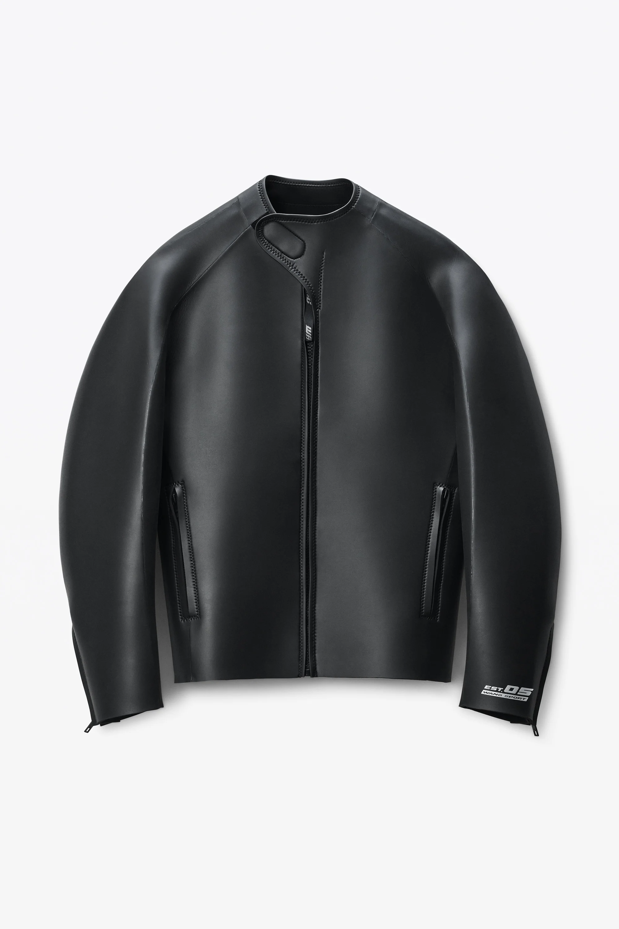 taking cues from a classic moto jacket with a mockneck, side pockets, and zipper-detailed cuffs, this black scuba style features sculpted sleeves with clean-finished interior seaming and a logo graphic at the chest. - crewneck - long sleeves - body composition: 100%rubber - base composition: 85% nylon/15% elastane - made in china - model is 6'1" and wears a size m - 6WC3252063001 composition Body: 100%COTTON