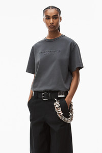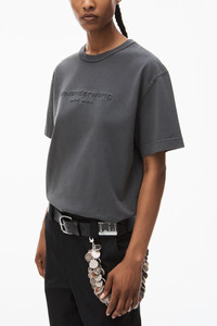 Acid-wash obsidian grey short-sleeve tee with embossed "Alexander Wang" logo at center front - unisex fit - hits at hip - unlined - bi-color dye technique with acid wash - body composition: 100% cotton - rib composition: 99% cotton/ 1% elastane - made in portugal - female model is 5'11" and wears size s - male model is 6'1" and wears size m - UCC1241698094A composition Body: 100%COTTON Rib: 99%COTTON/1%ELASTANE