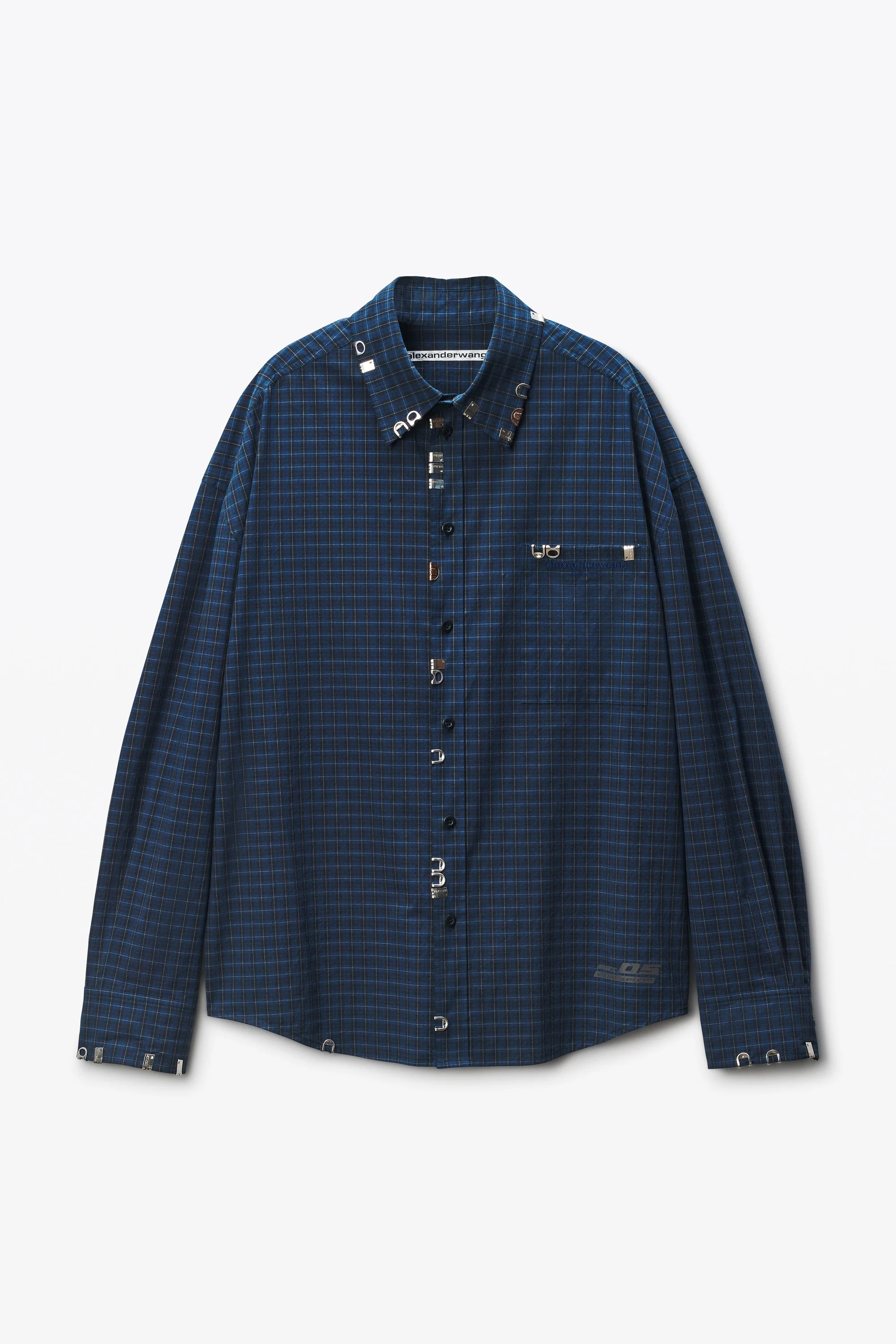 This navy plaid boxy shirt is characterized by an overdyed plaid in cotton poplin and detialed with a logo-emboridered chest pocket. - point collar - long sleeves - button placket - body composition: 100% cotton - made in china - model is 6'1" and wears a size m - 6WC3251093937 composition Body: 100%COTTON