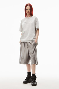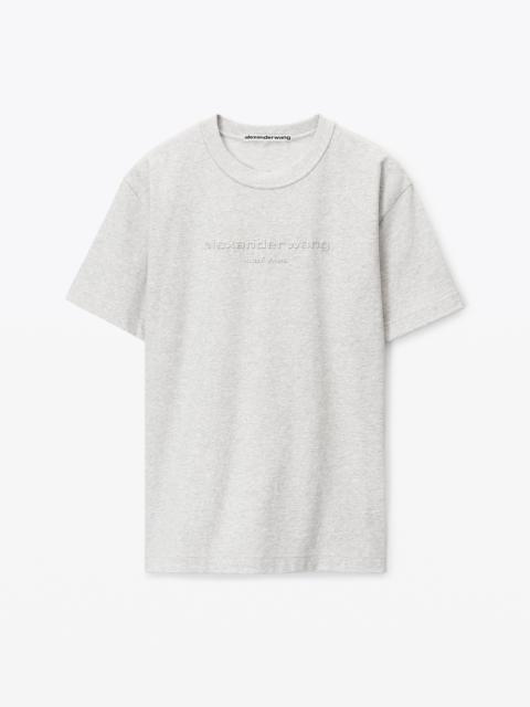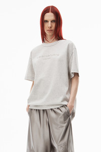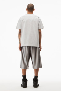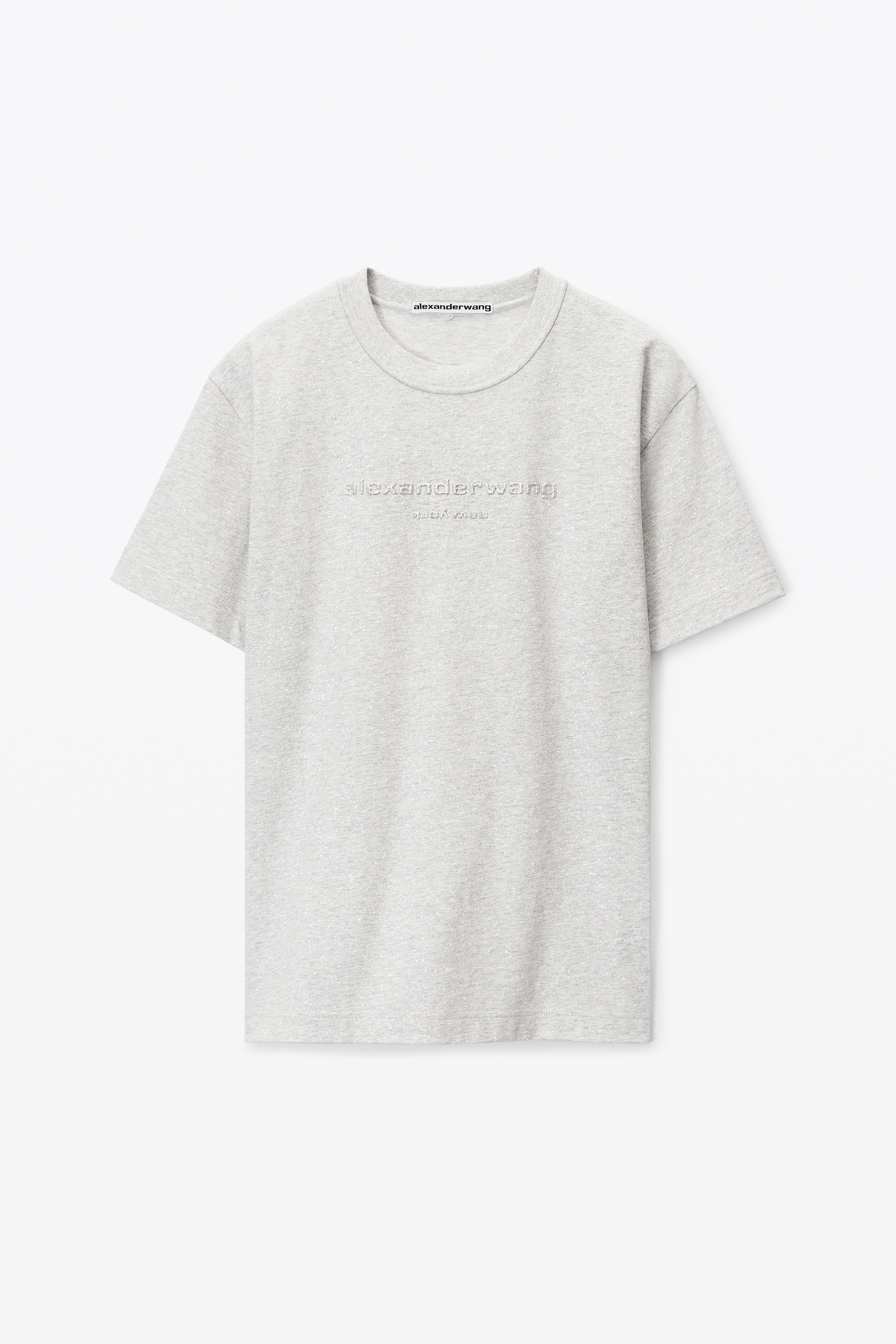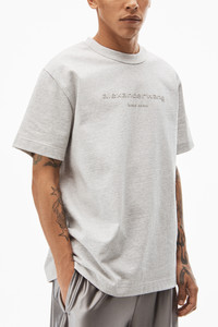 glitter wash short sleeve tee with "alexander wang new york" glitter puff logo printed on front in light heather grey jersey - unisex fit - hem hits at hip - composition: 100% cotton - made in portugal - female model is 5'11" and wears a size s - male model is 6' and wears a size m - UCC3231640050