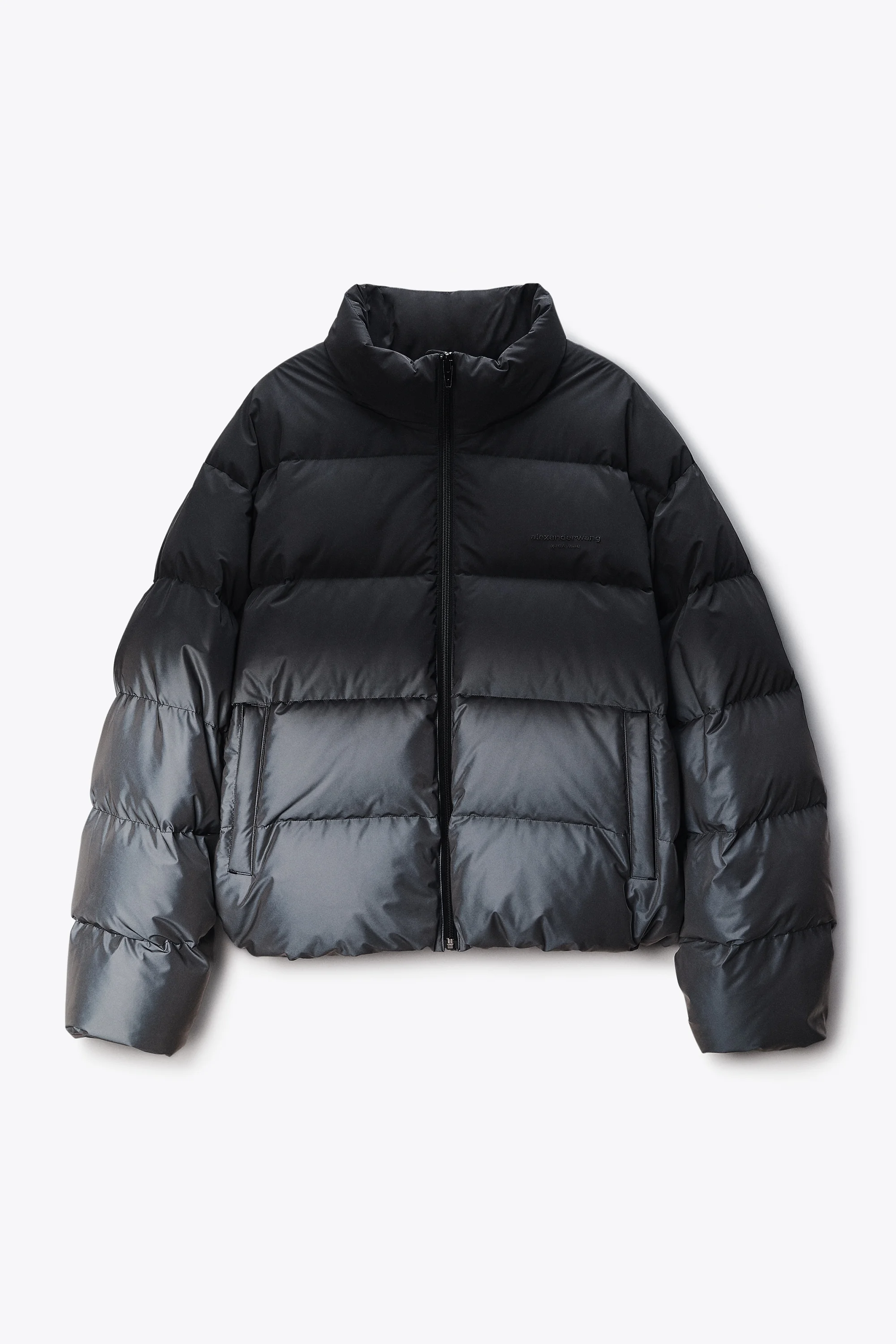 Silver-to-black gradient puffer coat finished with a reflective surface. Designed with a stand collar, zip front with guard, elasticated cuffs, and adjustable bungee hem, complete with zip welt pockets and logo embroidery at the chest. - Silver/Black - Front-Zip closure - Logo embroidery - Body composition: 100% polyester - Lining: 100% polyamide - Fill: 75% down/25% feather - Fill 2: 100% polyester - Made in China - Model is 6'1" and Wears a Size M - 6WC1263012965B composition Body: 100%POLYESTER LINING: 100%POLYAMIDE Filling: 75%DOWN/25%FEATHER Filling 2: 100%POLYESTER