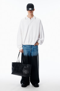 Vintage marbled blue denim reimagined with a partial black coating. The leather-like finish rises from the hem to above the thigh with a blurred edge, paired with a low-rise wide leg and button fly closure - Vintage Marbled Blue - Body composition: 100% cotton - Coating: 100% polyurethane - Model is 5'11" and Wears a Size 32 - Made in China - 6DC1264904400C composition Body: 100%COTTON Coating: 100%POLYURETHANE