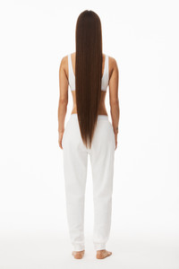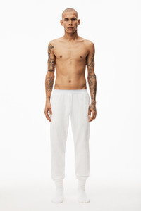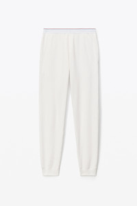 Unisex pull on jogger pant with ribbed cuff and logo elastic wasitband in white cotton waffle thermal. - slash pockets in lined jersey - relaxed fit - full length - unlined - composition: 97% cotton 3%elastane - made in china - model is 6'0" and wears size m - UCC4224071100