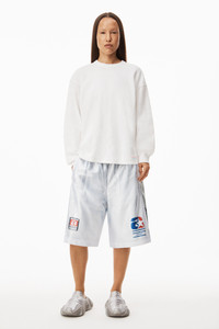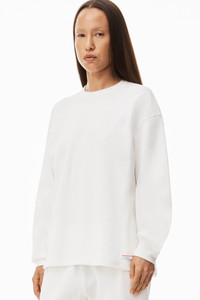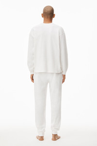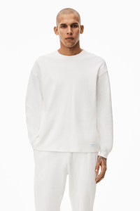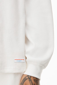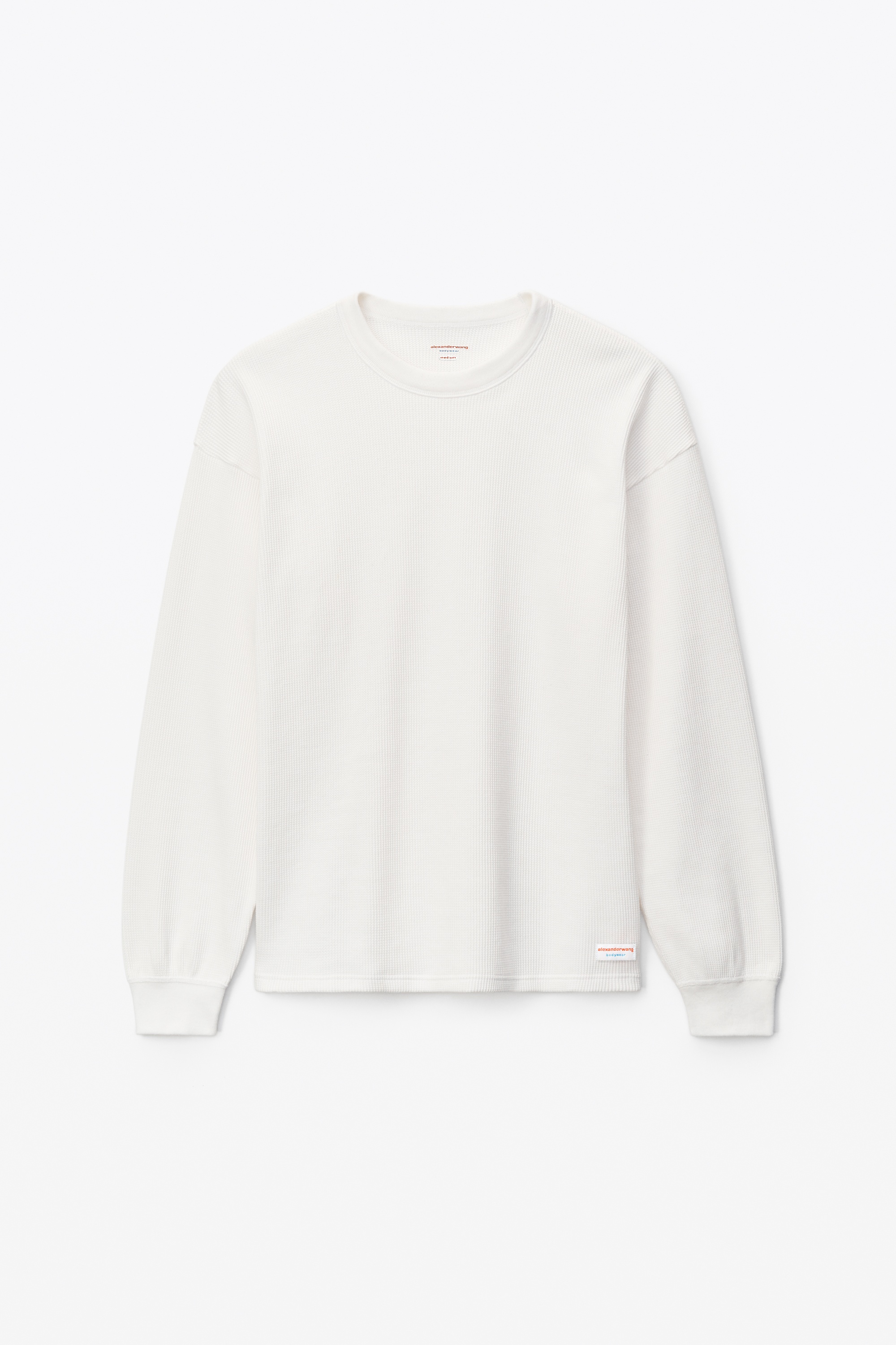 Unisex long sleeve crew neck with rib trim in white cotton waffle thermal. - relaxed fit - bottom hem hits at hips - unlined - composition: 97% cotton 3%elastane - made in china - model is 6'0" and wears size m - UCC4221611100