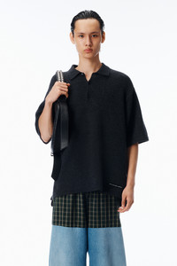 Black short sleeve knitted polo crafted from extra-soft wool. Designed with a fully fashioned collar, clean placket with horn buttons, and a technical knit logo label above the rib. - Charcoal - Short sleeves - Oversized fit - Rib trim - Body composition: 89% wool/ 9% polyamide/2% elastane - trim: 89% wool/10% polyamide/1% elastane - Model is 6'1" and Wears a Size M - Made in China - 6KC1261120010 composition Body: 89%WOOL (OVIS ARIES ARIES)/9%POLYAMIDE/2%ELASTANE Trim: 89%WOOL (OVIS ARIES ARIES)/10%POLYAMIDE/1%ELASTANE
