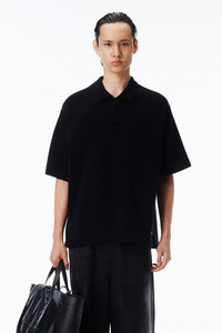Black short sleeve knitted polo crafted from extra-soft wool. Designed with a fully fashioned collar, clean placket with horn buttons, and a technical knit logo label above the rib. - Black - Short sleeves - Oversized fit - Rib trim - Body composition: 89% wool/ 9% polyamide/2% elastane - trim: 89% wool/10% polyamide/1% elastane - Model is 6'1" and Wears a Size M - Made in China - 6KC1261120001 composition Body: 89%WOOL (OVIS ARIES ARIES)/9%POLYAMIDE/2%ELASTANE Trim: 89%WOOL (OVIS ARIES ARIES)/10%POLYAMIDE/1%ELASTANE