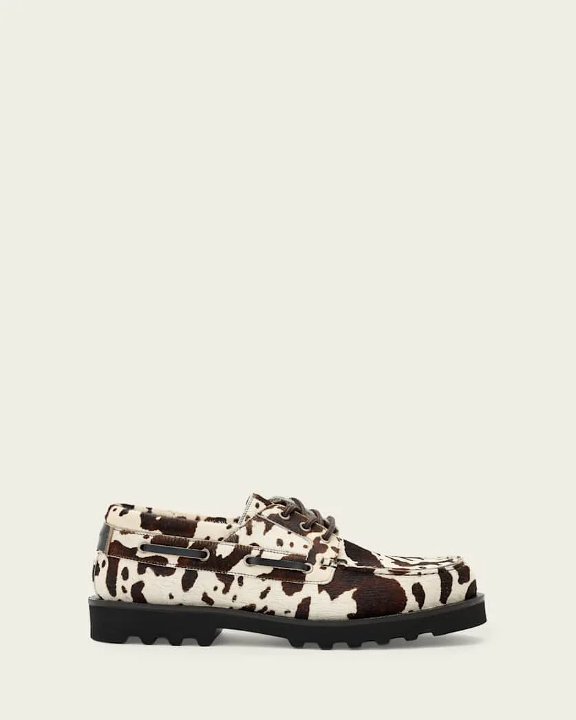 Skiff Boat Shoe Say howdy to your new outfit partner the Skiff Boat Shoe, a versatile option that matches perfectly with denim blue jeans as well as black pants. - Fits true to size - Almond toe - Lace up - Clean finish FABRIC & CARE: - Upper: 95% dyed hair on cowhide, 5% cow leather - Sock 1: 100% goat leather - Lining: 100% goat leather - Sole: 90% EVA, 10% rubber - Our products crafted from cowhide (hair-on-hide) are unique and variations in hair length, texture, color, and pattern are to be expected and are inherent characteristics of the product. These variations are not defects but rather enhance the individuality and natural beauty of each item. Over time, shedding or wear of the hair may occur. Made in: Portugal Product ID: USM011FE-9777