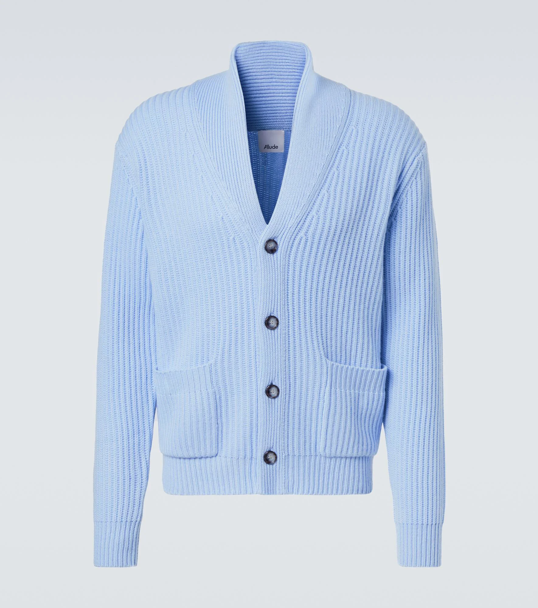 When it comes to knitwear, Allude is an industry expert. A staple layer to have on hand, this cardigan is made from a soft blend of wool and cashmere and features a ribbed-knit construction. Product Details - Material: 70% wool, 30% cashmere - Care instructions: hand wash - Made in China - Designer color name: 11 - Item color: blue - Closure: buttoned front - Pockets: patch pockets - Hem: ribbed - Item number: P01068751 Size & Fit - True to size - Dropped shoulders - Straight fit - Stretchy fabric - Falls to the hip - Height of model is 189cm-74.5" and wears a size L