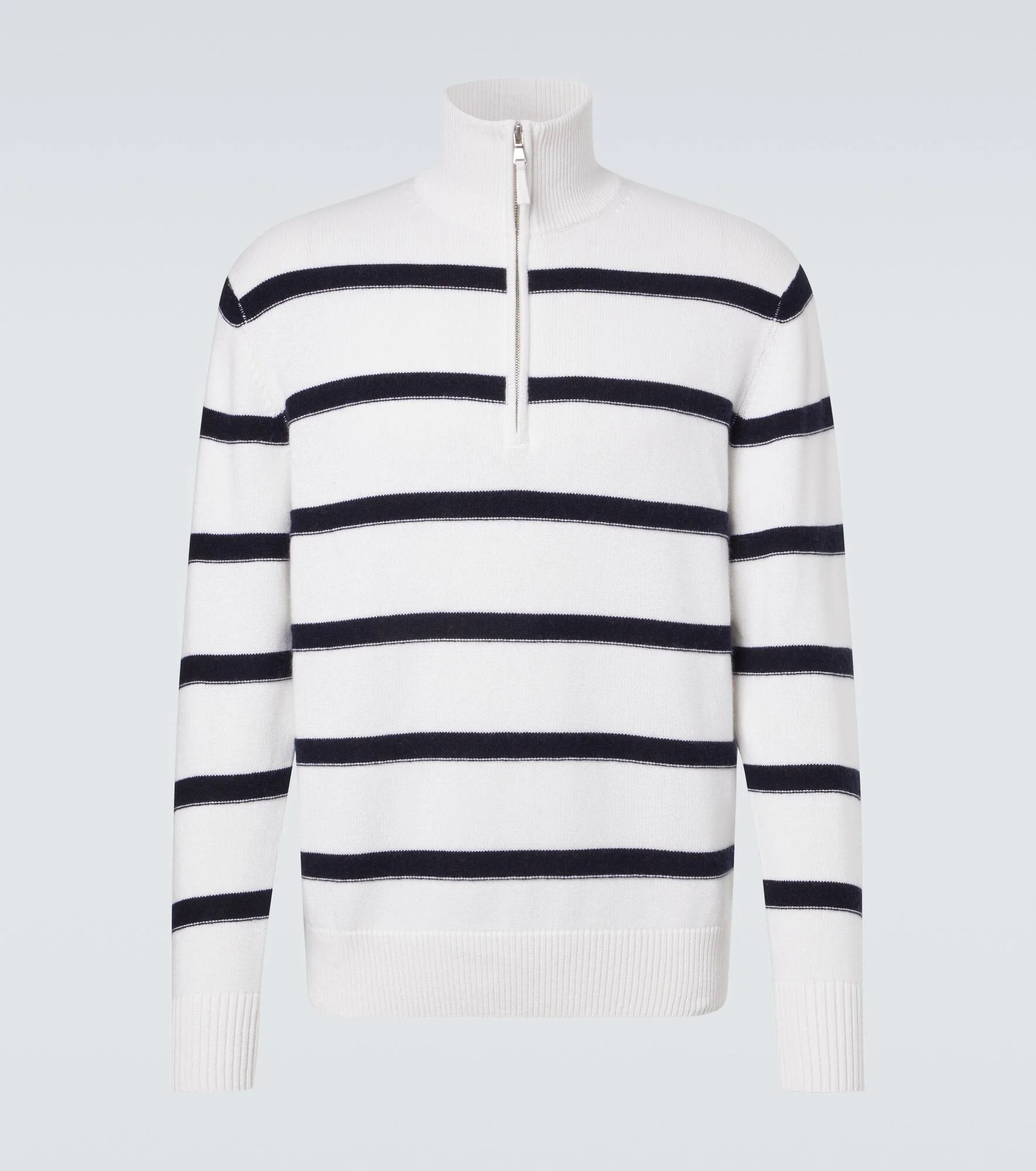 Allude creates refined cashmere pieces that unite classic style with modern design, echoing the meaning behind the brand’s name. This striped sweater is crafted from a soft cotton and cashmere blend and features a half-zip turtleneck, and ribbed-knit trims. Product Details - Material: 70% cotton, 30% cashmere - Care instructions: hand wash - Made in China - Color: white - Designer color name: 40/14 - Item color: blue, white - Closure: partially zipped front - Cuff: ribbed - Hem: ribbed - Item number: P01135631 Size & Fit - True to size - Straight fit - Slightly stretchy fabric - Falls below the hip - Height of model is 192cm-75.5" and wears a size L