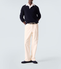 Allude creates refined cashmere pieces that unite classic style with modern design, echoing the meaning behind the brand’s name. This wool and cashmere polo sweater features a contrasting collar and ribbed-knit trims. Product Details - Material: 70% wool, 30% cashmere - Care instructions: hand wash - Made in China - Designer color name: 14/14 - Item color: blue, white - Collar: classic (Straight point) - Closure: partially buttoned front - Cuff: ribbed - Hem: ribbed - Item number: P01135686 Size & Fit - True to size - Straight fit - Slightly stretchy fabric - Falls to the hip - The model in the picture is 185cm-6'1" and wearing a size L
