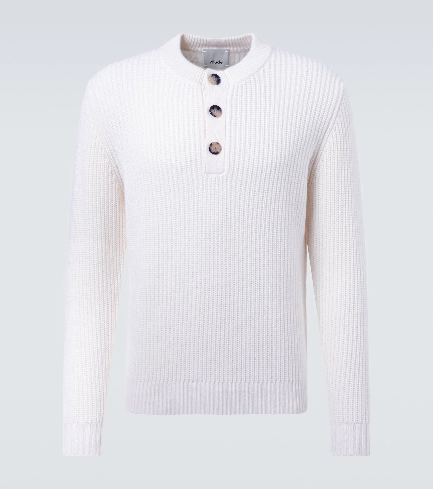 When it comes to knitwear, Allude is an industry expert. An essential for every well-rounded wardrobe, this sweater is a classic crewneck style made from a soft, white-hued blend of wool and cashmere. Product Details - Material: 70% wool, 30% cashmere - Care instructions: hand wash - Handmade in China - Designer color name: 40 - Item color: white - Hem: ribbed - Cuff: ribbed - Collar: crewneck - Closure: partially buttoned front - Item number: P01068740 Size & Fit - True to size - Straight fit - Slightly stretchy fabric - Falls to the hip - The model in the picture is 185cm-6'1" and wearing a size L