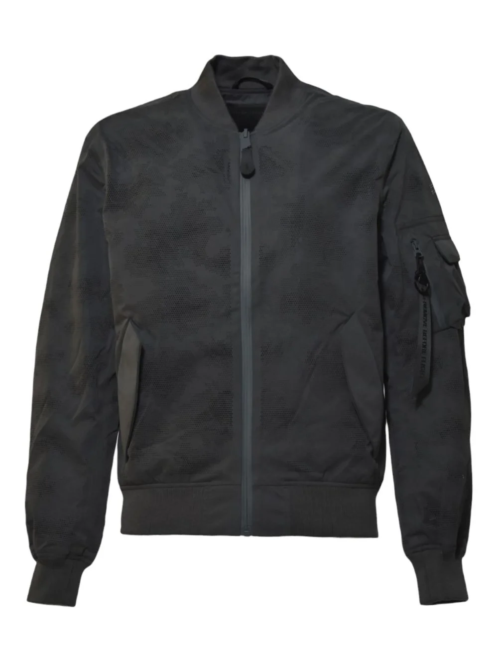 camouflage-pattern zip-up bomber jacket Highlights - Dark grey - Camouflage pattern - Zip fastening - Ribbed cuffs - Sleeve zip pocket - Baseball collar Imported Composition Outer: Polyester 100% Lining: Polyester 82% Washing instructions Specialist Cleaning