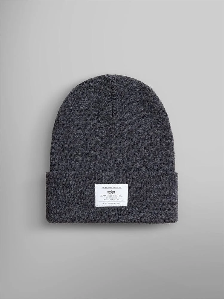 An essential beanie with Alpha paper label on front. No fall or winter outfit would be complete without adequate head protection. This soft, knit beanie brings to mind coziness and comfort, whether lounging by the fireplace or braving the outdoor chill. FEATURES - Alpha paper label on fold over cuff