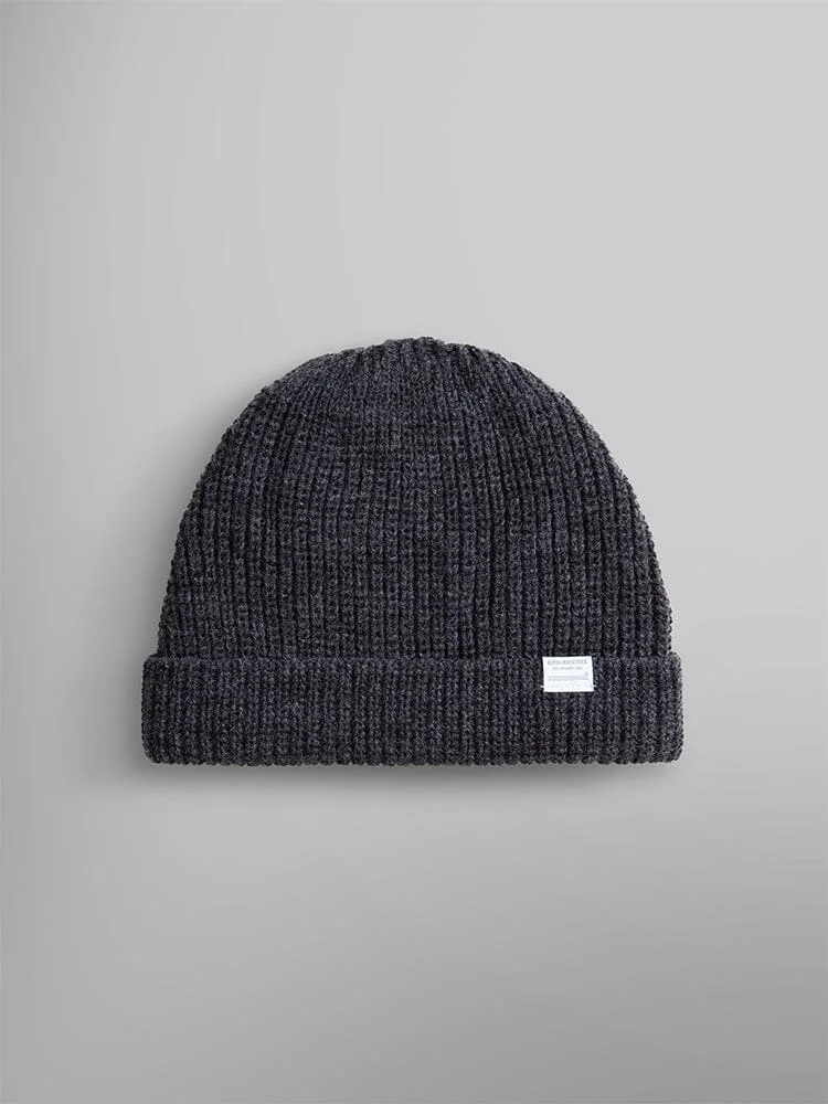 An essential watch cap with small Alpha label on front. This wool-blend watch cap is an adaptable piece of headwear modelled after the watch caps worn throughout military history, especially by Navy crews in World War II. It’s traditionally worn rolled up above the ears to keep your head warm without obstructing sound. FEATURES - Small Alpha paper label on fold over cuff