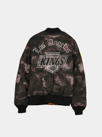 This Los Angeles Kings New Era x Alpha MA-1 Flight Jacket features an exclusive Black Camo pattern and reverses to an Emergency Orange lining. Details include a screen-printed logo at the right chest with a matching team graphic at the rear, a full-zip closure at the front, and a woven New Era Cap x Alpha Industries tag at the hem. Additional details include frayed edge alternate team logos at the left chest with city flag, New Era Cap patch, and patch at the right sleeve. The interior lining features a screen print graphic. BENEFITS - Lightly insulated for warmth - Water resistant - Reversible FEATURES - Screen-printed logo at the right chest with a matching team graphic at the rear - Full-zip closure at the front - Woven New Era Cap x Alpha Industries tag at the hem - Frayed edge alternate team logos at the left chest with city flag - New Era Cap patch, and patch at the right sleeve - Interior lining includes screen print graphic