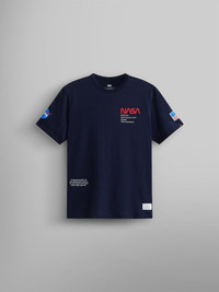 This comfortable tee commemorates NASA with themed graphic patches on the sleeves and the NASA worm logo on the chest. This classic red logo, so-called because of its worm-like letter styling, was used by NASA from 1975 to 1992. DETAILS A t-shirt with a NASA logo graphic on the chest and sleeve. FEATURES - Unisex style - NASA worm logo graphic at wearer's left chest - NASA logo on wearer's right sleeve - USA flag on wearer's left sleeve - Alpha paper label at bottom hem
