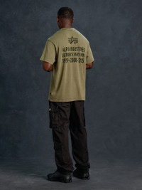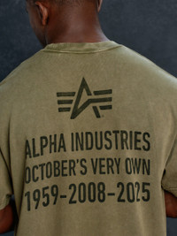 Alpha Industries and October’s Very Own unite to bridge heritage and modernity. Rooted in Alpha’s legacy of durable military design and reimagined through OVO’s refined perspective, the collection blends archival silhouettes, authentic color stories, and rugged foundations. Elevated fits, premium washes, and subtle detailing transform timeless styles into staples built for today. The OVO X ALPHA INDUSTRIES GARMENT DYE T-SHIRT features a garment dye treatment, along with screen print designs on the front and back. FEATURES - Screen print on front and back - Woven label