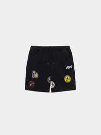 These knit jersey shorts feature a mix of print and embroidered patches inspired by artwork from U.S. Navy squadrons. FEATURES - Six military patches inspired by the US navy, 3 appliques and 3 prints - Two side seam pockets and one patch pocket at back - Inseam: 7"