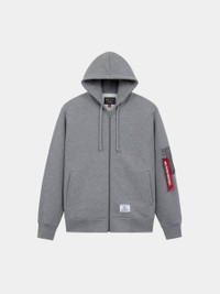 A functional take on a classic hoodie, the Utility Pocket Full Zip Up combines comfort with utility-inspired features. Made from a cotton-poly blend, this 320 GSM style includes a full front zipper, an adjustable hood, and Alpha embroidery on the sleeve. An MA-1 inspired utility pocket with red ribbon on the arm completes the look, merging casual comfort with military- inspired style. FEATURES - Utility pocket on sleeve with Alpha red ribbon - Center front zipper closure - Hood with drawcord adjust - Alpha embroidery on sleeve