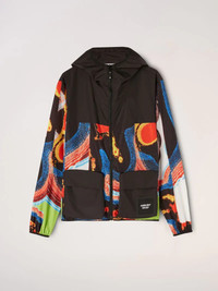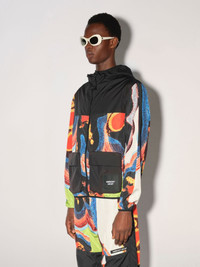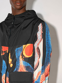 Black, long-sleeved hooded nylon jacket featuring an all-over multicolor motif print, the AMBUSH® WKSP logo label sewn at the front, as well as pockets and a black zip closure. Product ID: BMEB011F22FAB0018410 SIZING MODEL ELHADJI WEARS SIZE M HEIGHT: 6’ 2” (190 CM) BUST: 30” (89 CM) WAIST: 23” (73 CM) HIPS: 38” (96 CM) MATERIAL FABRIC 86% POLYESTER 14% POLYURETHANE - DETAILS 80% POLYAMIDE 20% ELASTAN