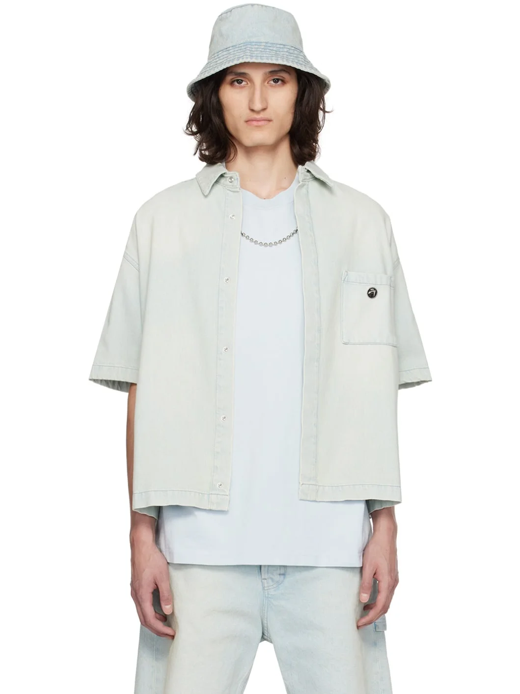 Non-stretch denim shirt. Fading throughout. · Spread collar · Concealed press-stud closure · Logo hardware at patch pocket · Shirttail hem · Single-press-stud barrel cuffs · Contrast stitching in gray Supplier color: Light blue 100% cotton. Made in Italy 241820M192002