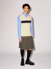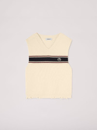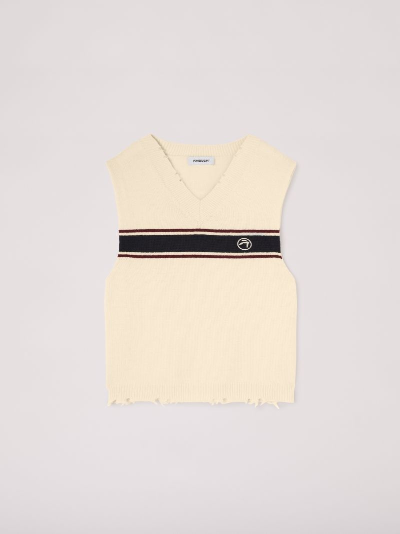 This V-neck knit vest features a sportive stripe across the chest and the 'AMBLEM' logo on the chest. Product ID: BMHZ001F24KNI0013131 SIZING Model Austin wears size M Height: 6’ 2” (188 cm) Bust: 34” (86 cm) Waist: 29.5” (75 cm)