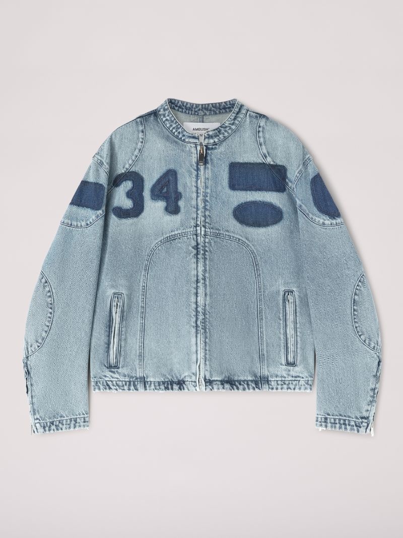 This denim jeans jacket is designed like a cafe racer, featuring a vintage wash with ripped-off patches effect. Product ID: BMYE002F24DEN0024400 SIZING Model Austin wears size M Height: 6’ 2” (188 cm) Bust: 34” (86 cm) Waist: 29.5” (75 cm)