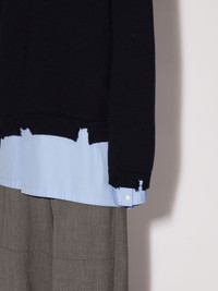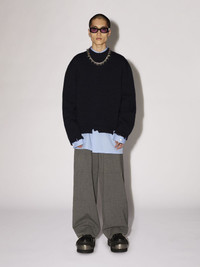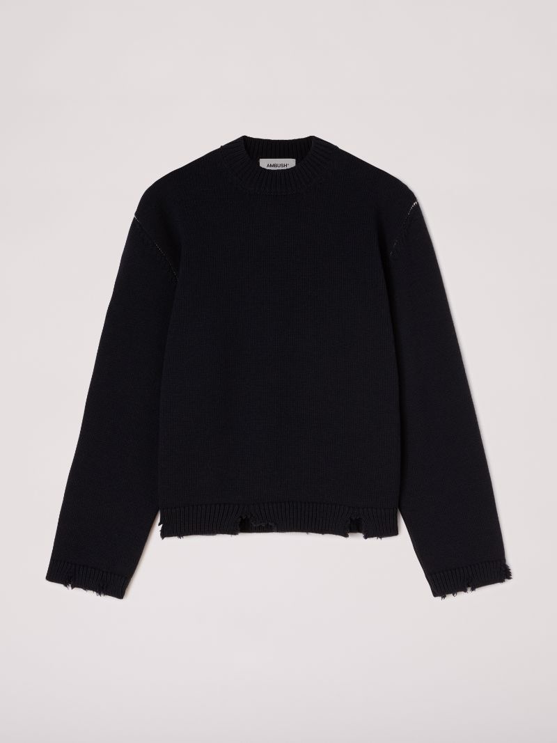 This distressed sweater made from 100% virgin wool features a ribbed crew neck, a distressed finish, a relaxed fit, long sleeves, and an unfinished hem. Product ID: BMHE035F23KNI0014600 SIZING MODEL MINYUNG WEARS SIZE M HEIGHT: 6’ 06” (185 CM) BUST: 2' 78” (85 CM) WAIST: 2' 19” (67 CM) HIPS: 2' 82” (86 CM) MATERIAL FABRIC 100% VIRGIN WOOL
