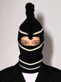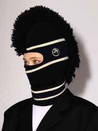 This knit balaclava features sportive stripes, the 'AMBLEM' logo, and punk fringe. Product ID: BMLC001F24KNI0011031