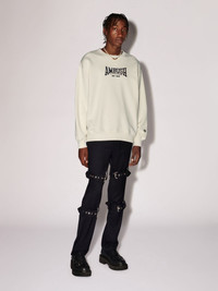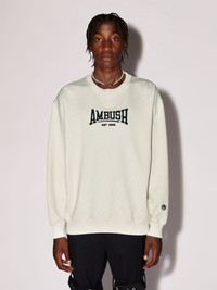 The crewneck sweatshirt features the AMBUSH® graphic logo with rib-knit collar, hem and cuffs. Product ID: BMBA001S24FLE0013145 SIZING Model Kizito wears size M Height: 6’ 2” (188 cm) Bust: 34” (86 cm) Waist: 25” (66 cm)