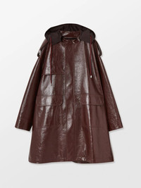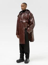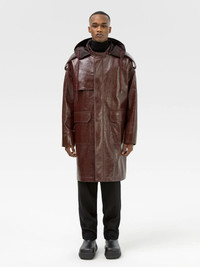 Long hooded leather coat layered with water repellent fabric on the hood and sleeves. Product ID: BMJA008F21LEA0012800 SIZING Model Malik wears size M Height: 6' (185 cm) Bust: 35" (89 cm) Waist: 27" (68 cm) MATERIAL FABRIC: 100% LEATHER LINING: 100% POLYESTER