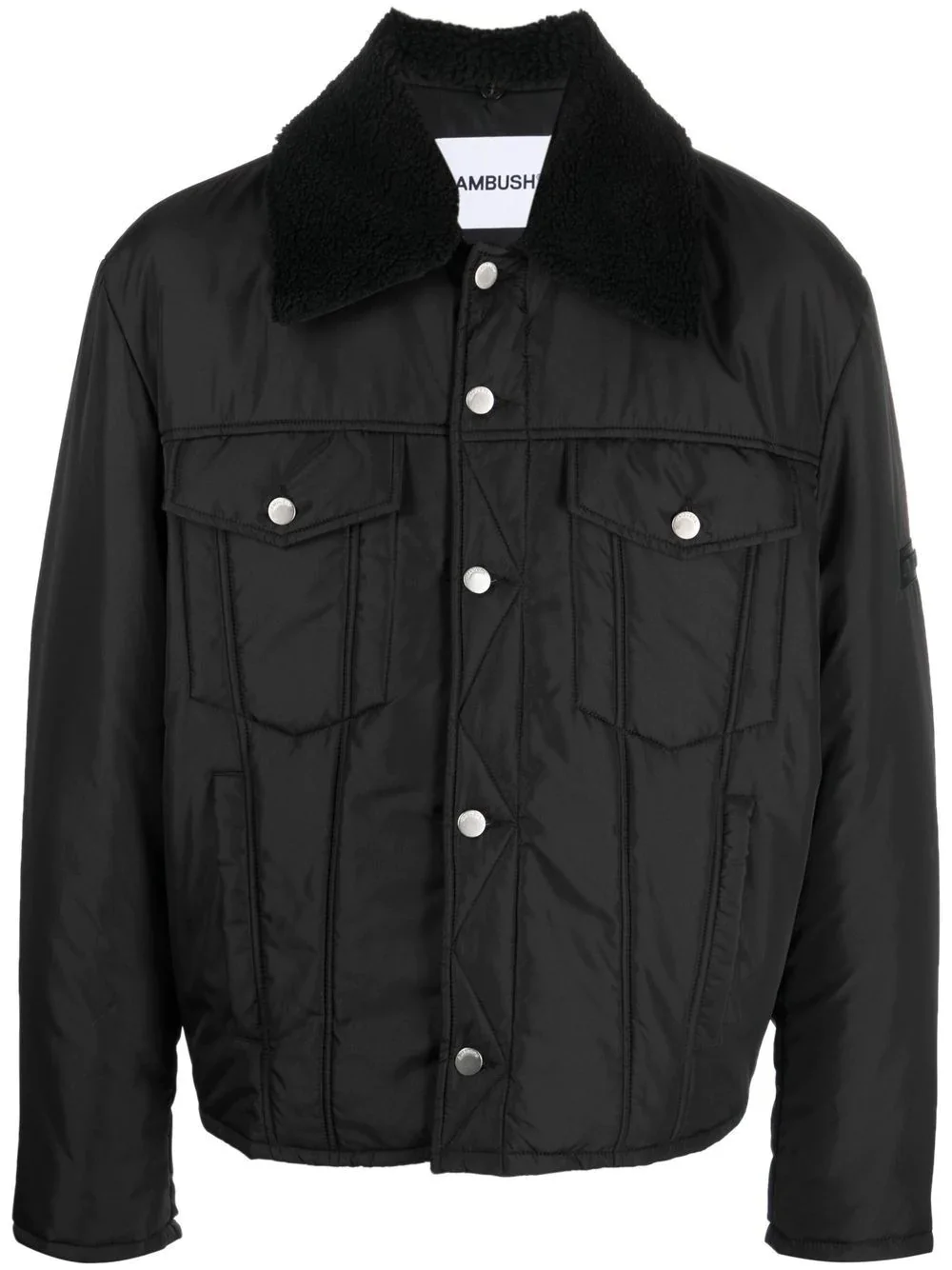 logo-embossed padded short jacket Italian-crafted, AMBUSH's padded short jacket showcases the label's timeless appeal through its contemporary styling and relaxed silhouette. Built with an embossed logo to the back, the tonal shape features a shearling collar and silver-tone logo-engraved button fastenings. Made in Italy Composition Outer: Polyester 86%, Polyurethane 14% Lining: Polyester 100%