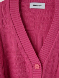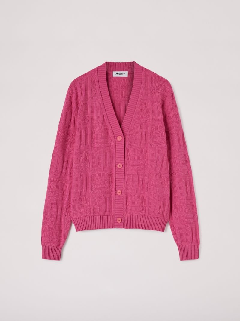 The pink, long-sleeved knitted cardigan is detailed with the AMBUSH® monogram logo all-over print, a rib knit collar, cuffs and hem, as well as a button closure down the front. Product ID: BWHB018S23KNI0013200 MATERIAL TESSUTO: 35% PA 30% WO 30% VI 5% WS