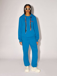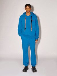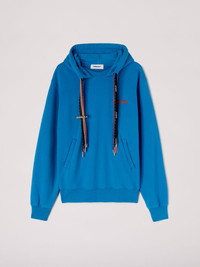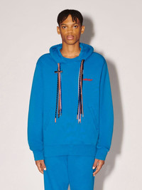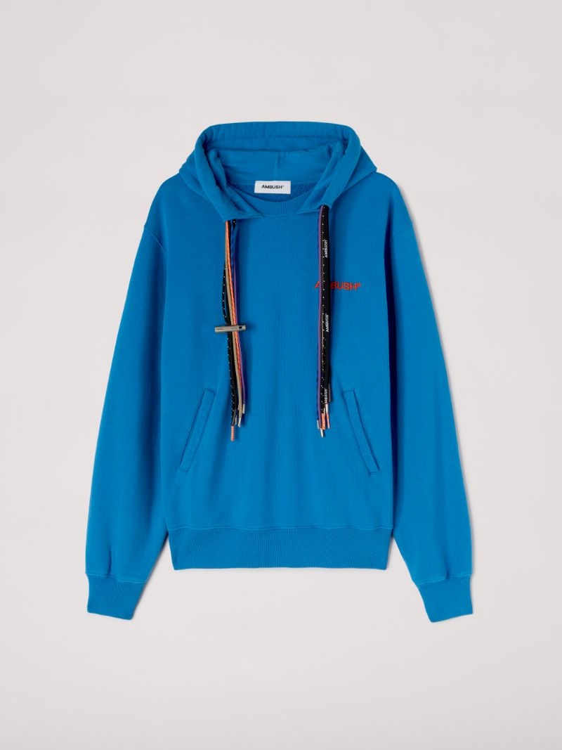 The blue, long-sleeved hooded sweatshirt made from 100% cotton features multicolor cord detailing, a kangaroo pocket and the AMBUSH® logo embroidered in red at the front. Product ID: BMBB021S23FLE0014720 SIZING MODEL CLINTON WEARS SIZE M HEIGHT: 6’ 13” (187 CM) BUST: 34” (87 CM) WAIST: 26” (68 CM) HIPS: 36” (92 CM) MODEL HARLEY WEARS SIZE M HEIGHT: 5’ 11” (180 CM) BUST: 32” (82 CM) WAIST: 24” (61 CM) HIPS: 35” (89 CM) MATERIAL FABRIC 100% COTTON