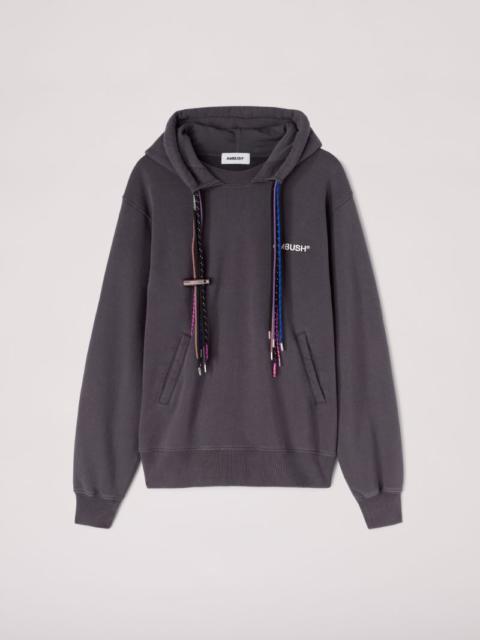 The dark grey, long-sleeved hooded sweatshirt made from 100% cotton features multicolor cord detailing, a kangaroo pocket and the AMBUSH® logo embroidered at the front. Product ID: BMBB021S23FLE0010704 SIZING MODEL CLINTON WEARS SIZE M HEIGHT: 6’ 13” (187 CM) BUST: 34” (87 CM) WAIST: 26” (68 CM) HIPS: 36” (92 CM) MODEL HARLEY WEARS SIZE M HEIGHT: 5’ 11” (180 CM) BUST: 32” (82 CM) WAIST: 24” (61 CM) HIPS: 35” (89 CM) MATERIAL FABRIC 100% COTTON