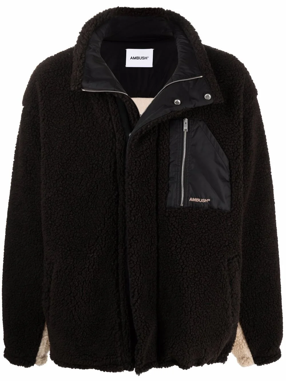 panelled sherpa jacket A fine example of AMBUSH's directional Tokyo aesthetic, this brown-hued sherpa jacket has been detailed to the rear with a contrasting cream panel for a contemporary touch. Made in Italy Composition Outer: Polyamide 100%, Polyester 50%, Virgin Wool 50% Lining: Polyester 100% SIZE & FIT Model measurements Height 6 ft 2 in(1.87 m) Bust/Chest 36.41 in(92.5 cm) Hips 37 in(94 cm) Waist 29.52 in(75 cm) FittingInformation This piece fits true to size. We recommend you get your regular size Cut for a loose fit Made with a mid-weight non-stretch fabric Washing instructions Dry Clean Only