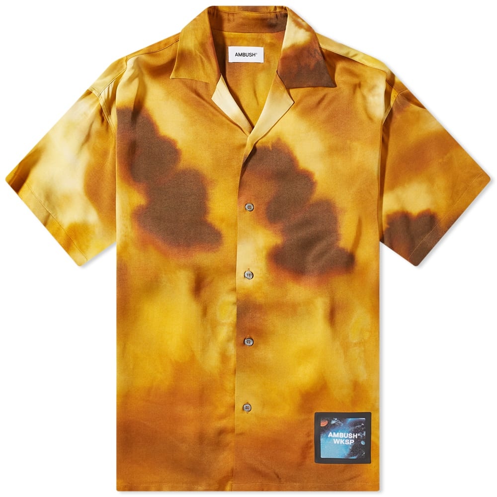 Abush gets you ready for summer nights and long vacations with this vacation shirt. Made to the classic bowling shirt style with the relaxed fit and short sleeves, this shirt is made with an all over fiery smoke design on a yellow background. The brand’s logo is printed on a patch on the bottom. - 100% Viscose - Classic Collar - Button Closure - Printed Branding - Made in Italy