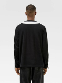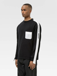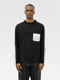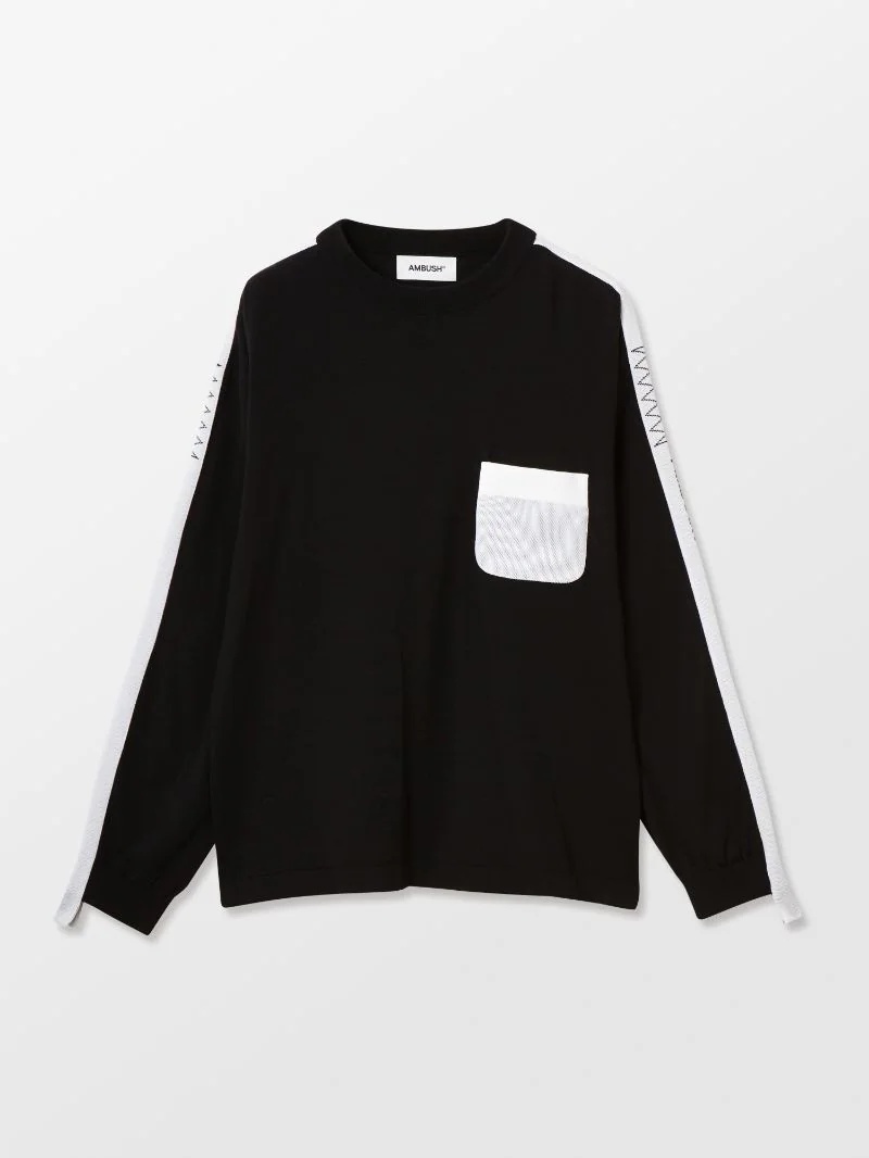 Knitted sweater with contrasted taped sleeves and front pocket.