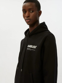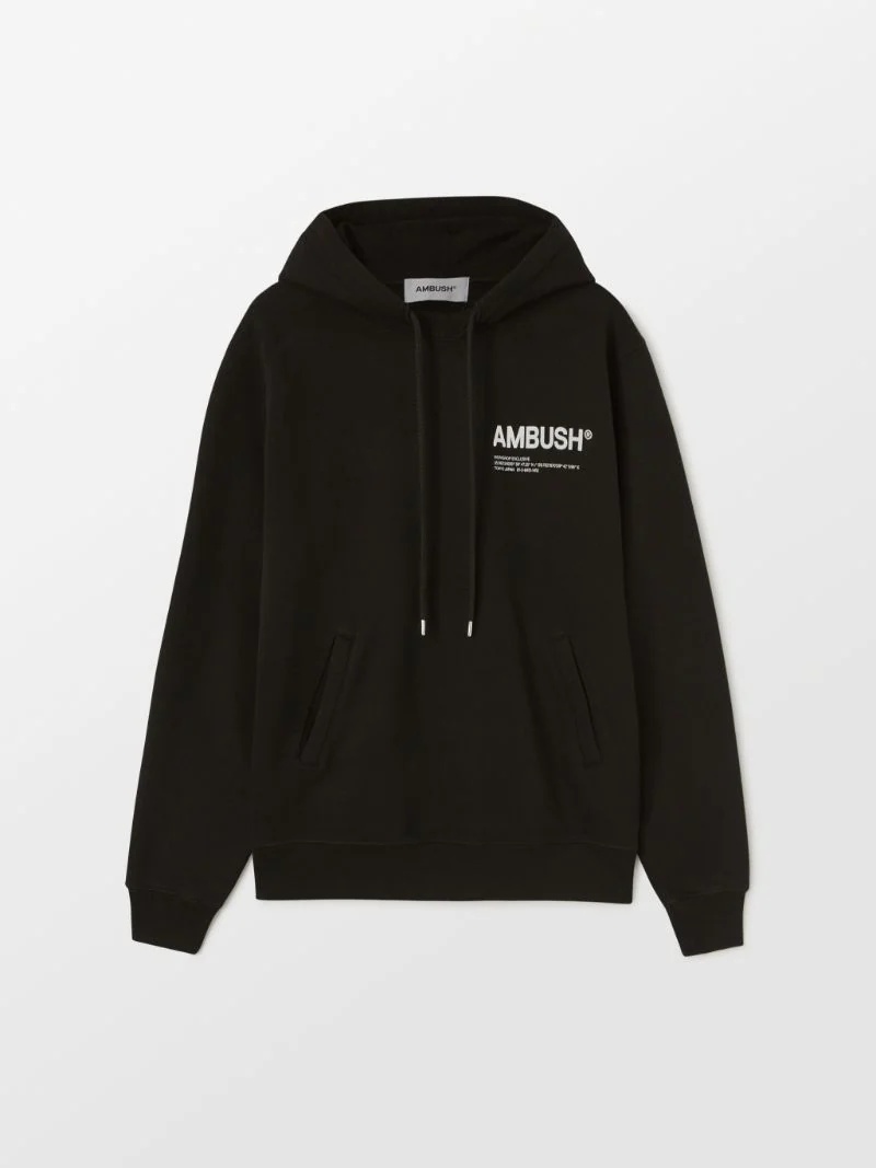 Hoodie with drawstrings and original AMBUSH® print on the chest. Product ID: BMBB012S22FLE0011002 SIZING MODEL OUMAR WEARS SIZE M HEIGHT: 6’1” (187 CM) BUST: 34” (88 CM) WAIST: 28” (71 CM) HIPS: 32" (82 CM) MATERIAL FABRIC:COTTON100%