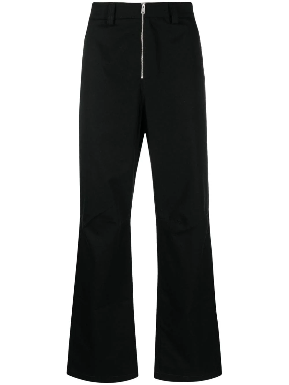 zip-up cotton loose-fit trousers Highlights - Black - Cotton - Logo patch to the rear - Seam detailing - Flared - Front zip fastening - Two side slash pockets - Two rear patch pockets - Straight hem Made in Italy Composition Lining: Cotton 100% Outer: Polyester 65%, Cotton 35% SIZE & FIT Model measurements Height 6 ft 1 in(1.86 m) Bust/Chest 34.64 in(88 cm) Hips 35.43 in(90 cm) Waist 27.55 in(70 cm) FittingInformation Designed for a straight-leg, allowing for an unrestricted and comfortable fit over the leg Made from a midweight non-stretch fabric This piece fits true to size – take your usual size Washing instructions Machine Wash