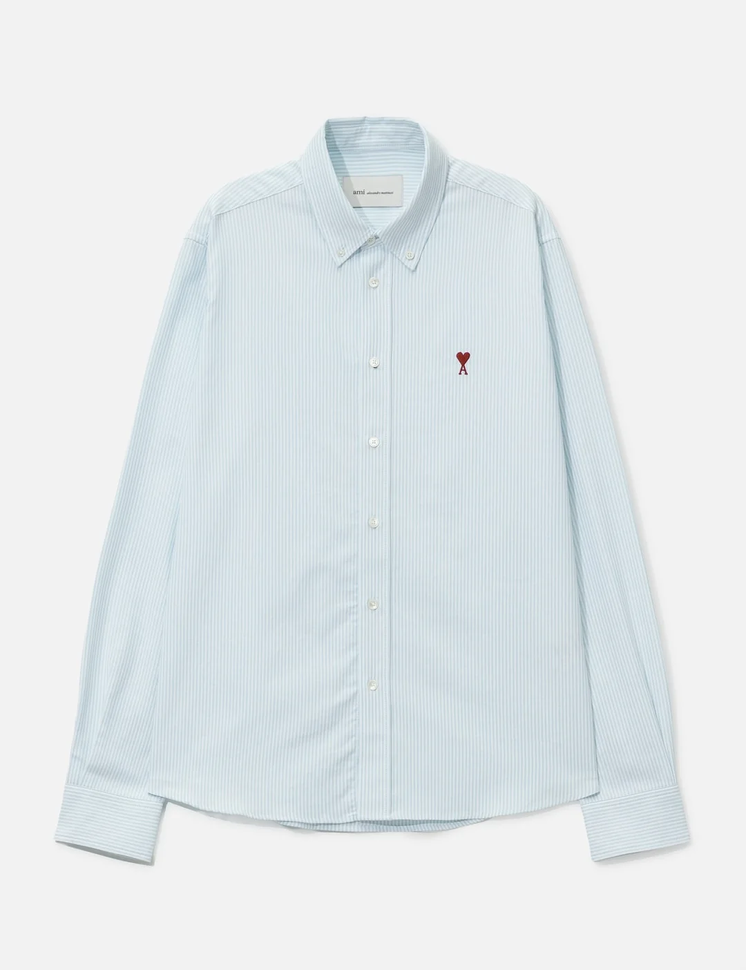 - Ami - Ami De Coeur Button Down Shirt - Unisex - Classic fit - Down collar - Removable collar stays - Long sleeve - Button closure - Mother-of-pearl buttons - Red Ami de Coeur chest embroidery - Buttoned tab on front and cuffs - Curved hem - Made in Poland - Color: Sky Blue/natural White - Material: 100% Cotton - See more Shirts and Clothing - Model wears size M - Model measures: Height 186cm, Chest 34”/86cm, Waist 28”/71cm, Hip 36”/91cm - Model wears size S - Model measures: Height 180cm, Chest 28.3’’/72cm, Waist 22’’/56cm, Hip 35’’/89cm - Vendor Code: BFUSH063.CO0087