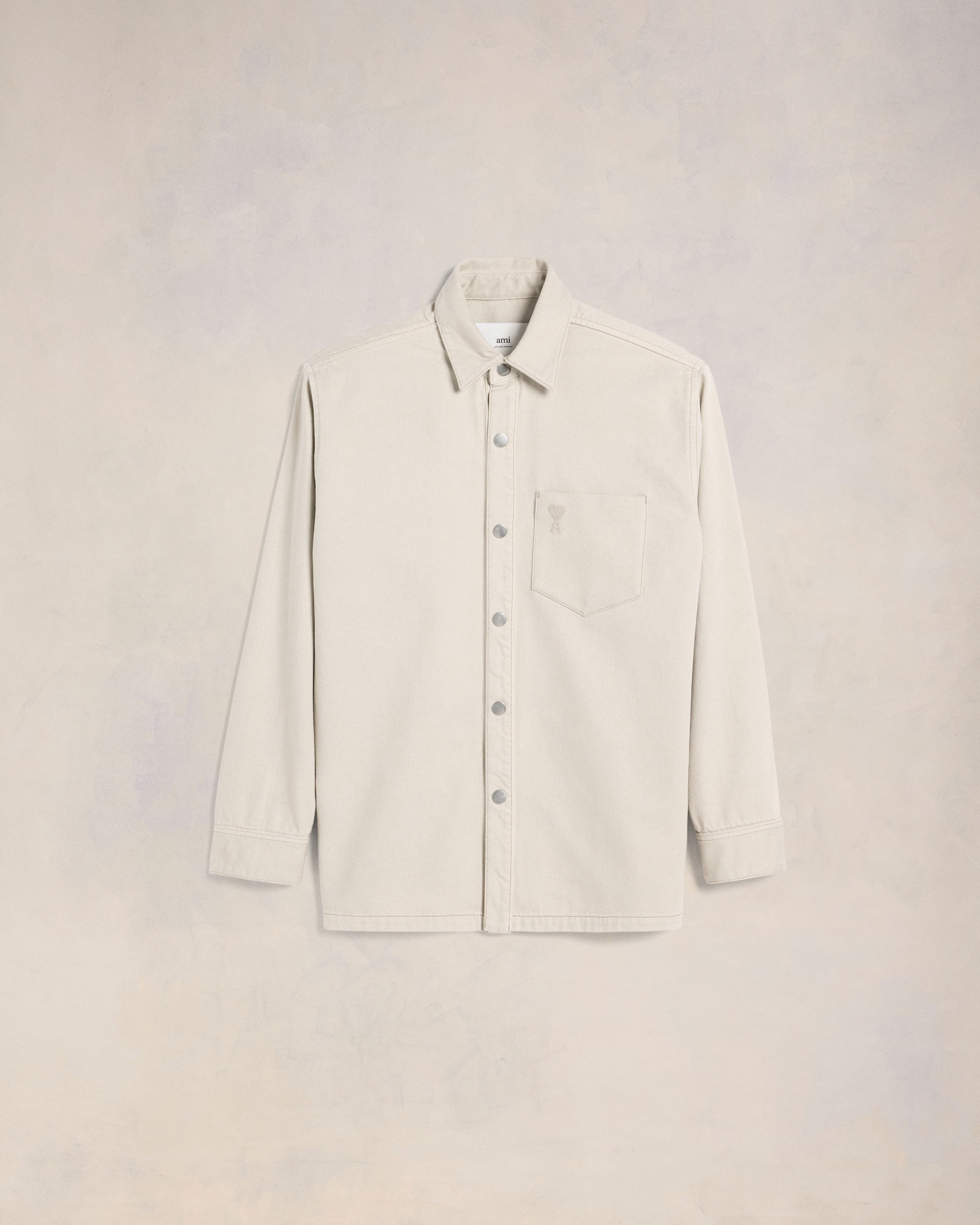 Overshirt in colored cotton twill. Unisex product 70 cm center back length (size 26) 77 cm center back length (size 30) Embossed Ami de Coeur on chest pocket First snap button in nickel color on the collar with "ami" banding Slightly contrasted topstitches Made in Tunisia (with love) REF : UJK261.CO0037.150 SIZE & FIT This style is unisex. For man, take your normal size. For woman, take one size down than your usual size. Man model is 1m84 / 6'0" and is wearing a size M. Woman model is 1m73 / 5'8" and is wearing a size XS. COMPOSITION & CARE GUIDE 100% Cotton Machine wash at 30°C Chlorine prohibited Do not tumble dry Line dry in shade Medium iron Dry clean possible
