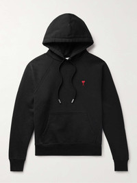 AMI PARIS' hoodie is embroidered with the label's signature 'Ami de Coeur' motif in contrasting red threads – designer Alexandre Mattiussi uses the same symbol when signing cards. It's cut from soft organic cotton-jersey in a relaxed shape and has a roomy pouch pocket. Size & Fit - Fits true to size. Take your normal size - Designed for a slightly loose fit - Mid-weight, slightly stretchy fabric - Model is shown wearing a M - S/M/L sizing Details & Care - Black organic cotton-blend jersey - 99% organic cotton, 1% elastane - Machine wash